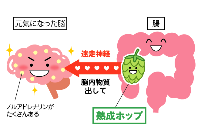 熟成ホップを摂取すると、腸に入った熟成ホップの成分が迷走神経を刺激して、脳内物質ノルアドレナリンの量を増加させます。
