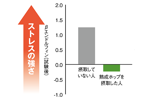熟成ホップを摂取した場合としていない場合でストレス指標のβエンドルフィン濃度を比較すると、摂取した場合の方が低値を示し、ストレス状態の改善が確認されました。