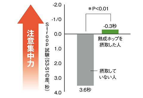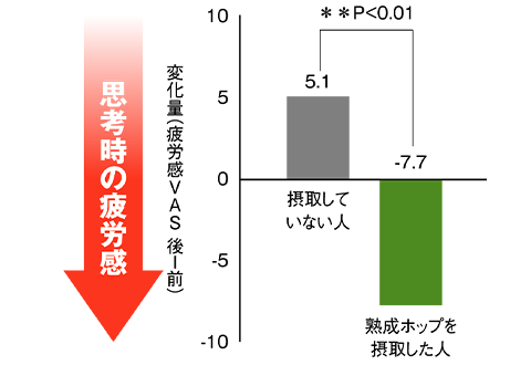 思考や集中など脳を使う作業を行った後の疲労感を比較すると、熟成ホップを摂取したグループの疲労感が少ないことが確認されました。